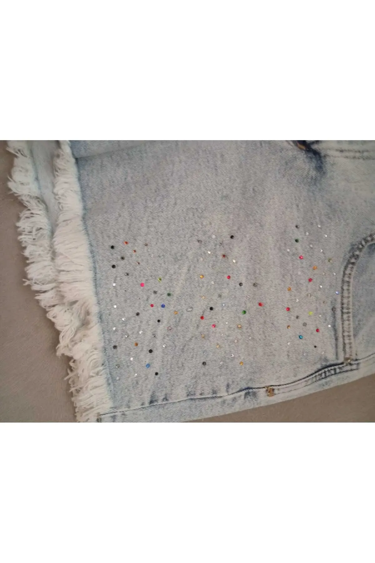 Yeni sezon önü tamamen harika taşlarla kaplı yüksek bel paça püskül detaylı harika mavi kot şort